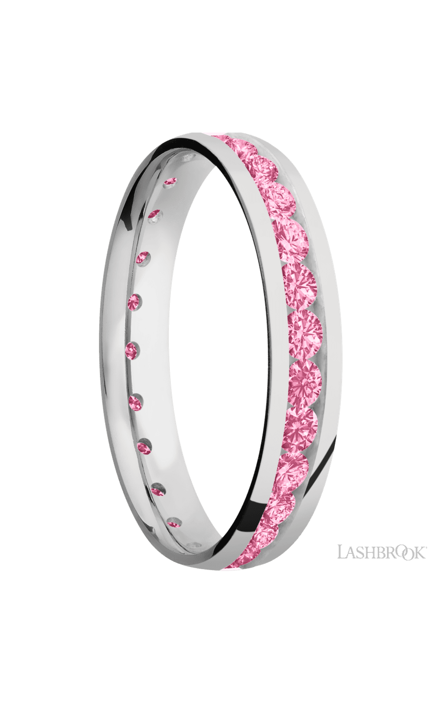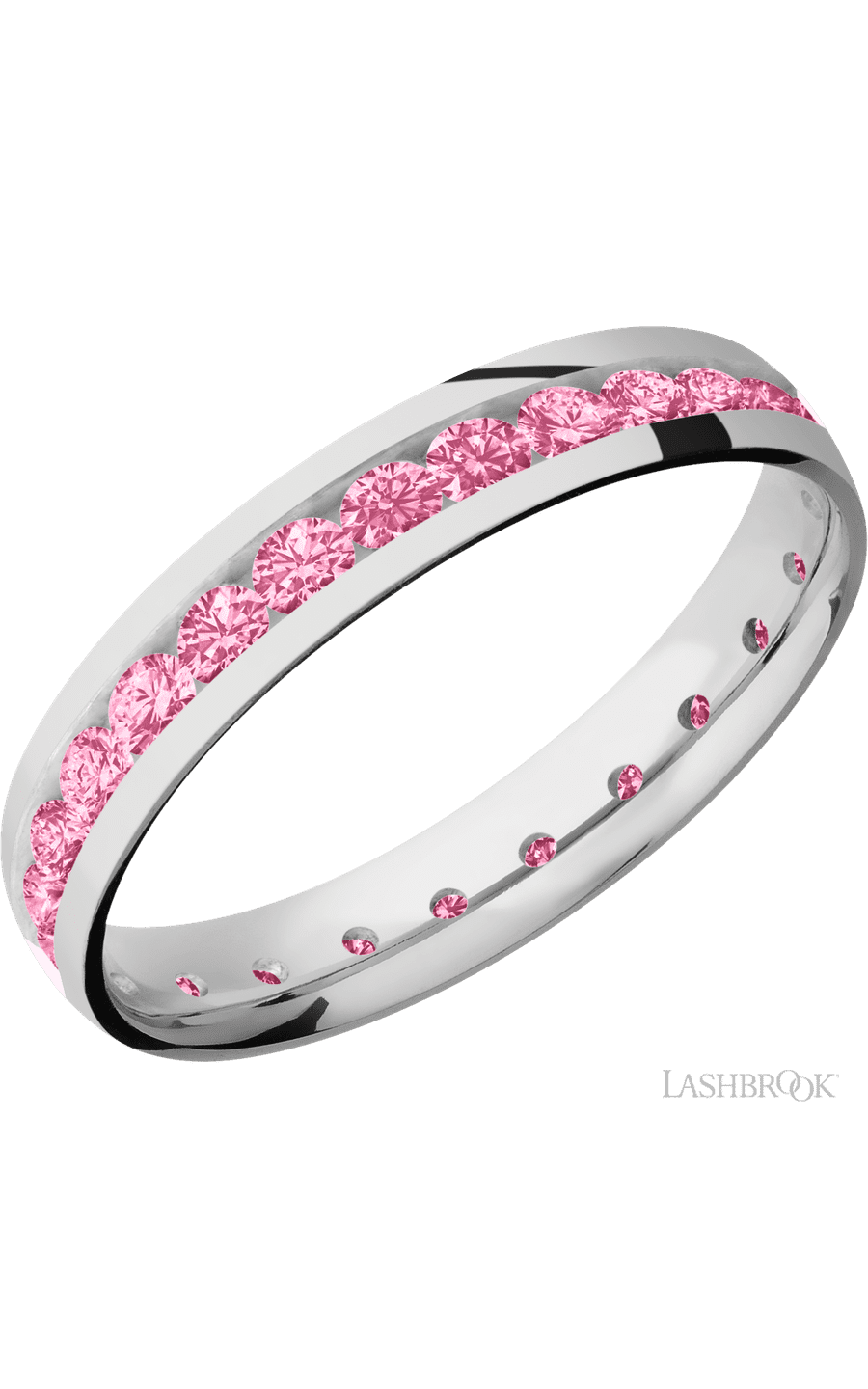 4 mm wide/Domed/Cobalt Chrome band with an Eternity arrangement of .07 carat Round Lab Dark Pink Diamond stones in a Channel setting.