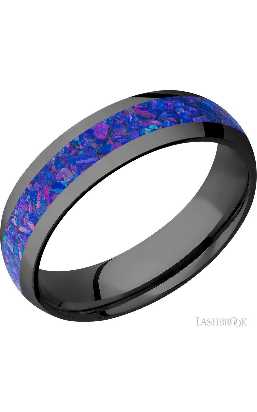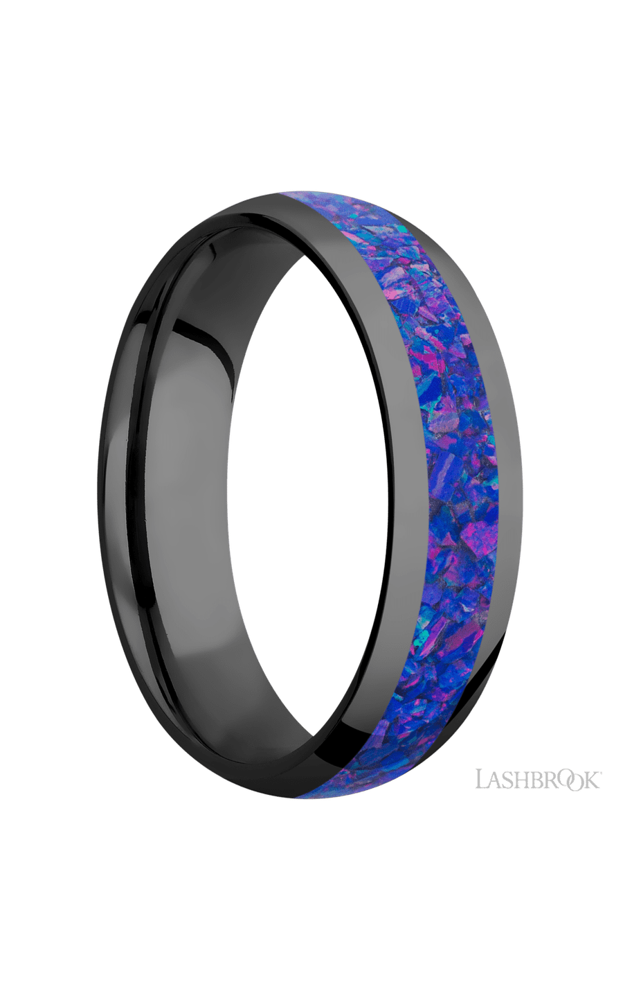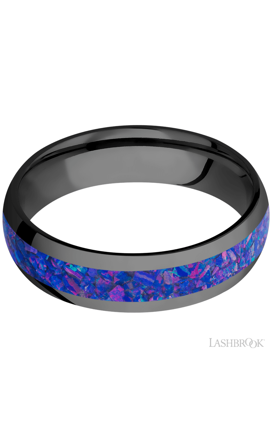 6 mm wide/Domed/Zirconium band with one 3 mm Centered inlay of Purple Opal.