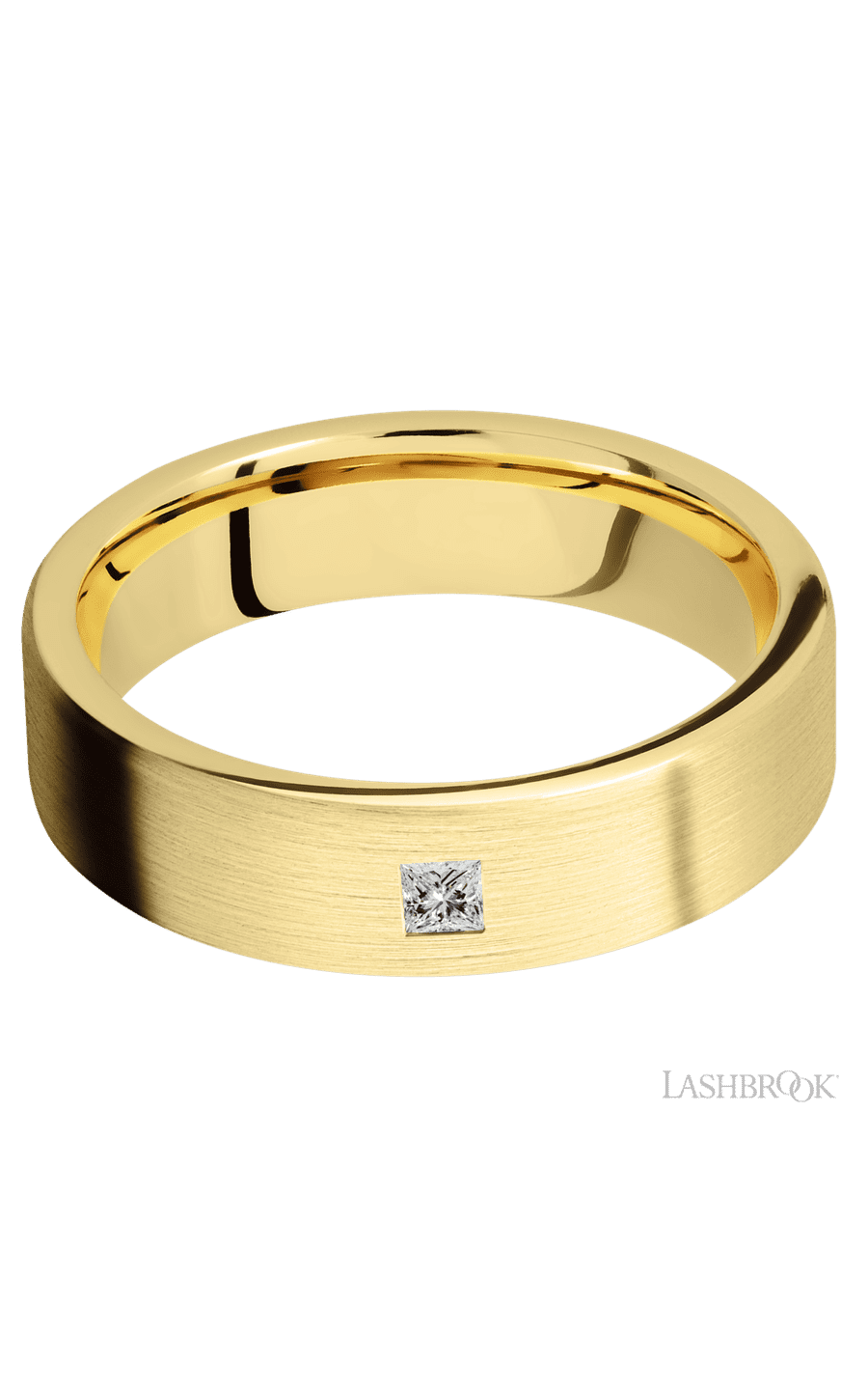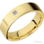 6 mm wide/Flat/14K Yellow Gold band with an arrangement of 1, .1 carat Princess Diamond stones in a Flush setting.