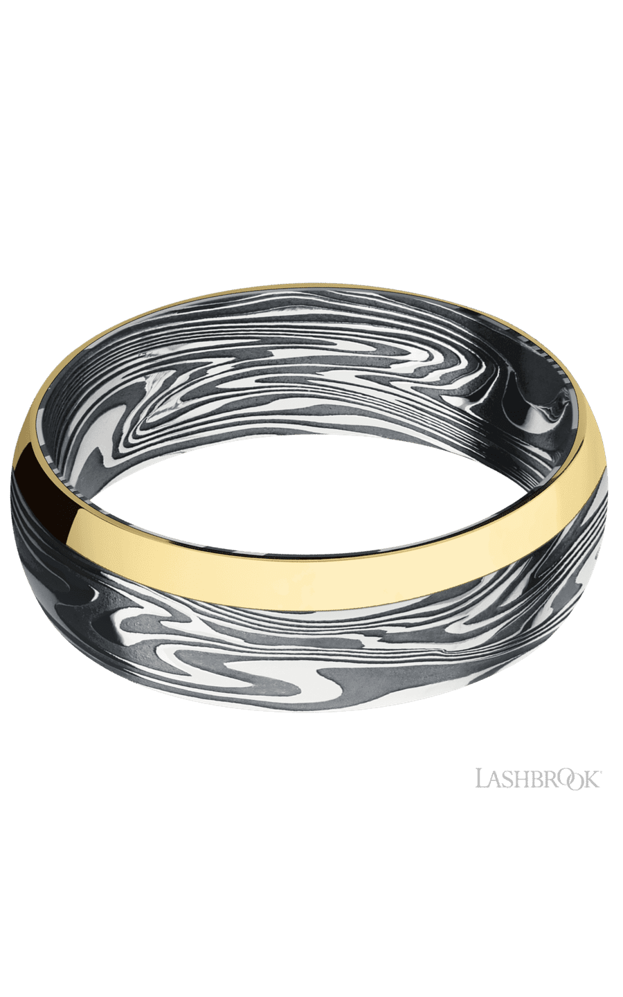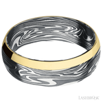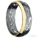 7 mm wide/Domed/Kinetic band with one 2 mm Off Center Edge inlay of 14K Yellow Gold.