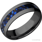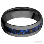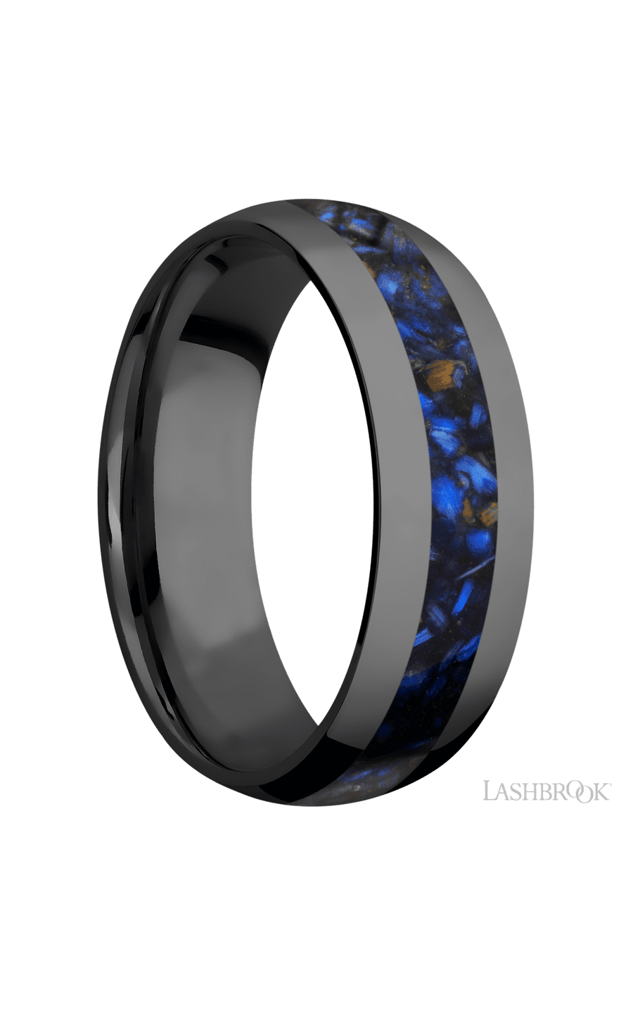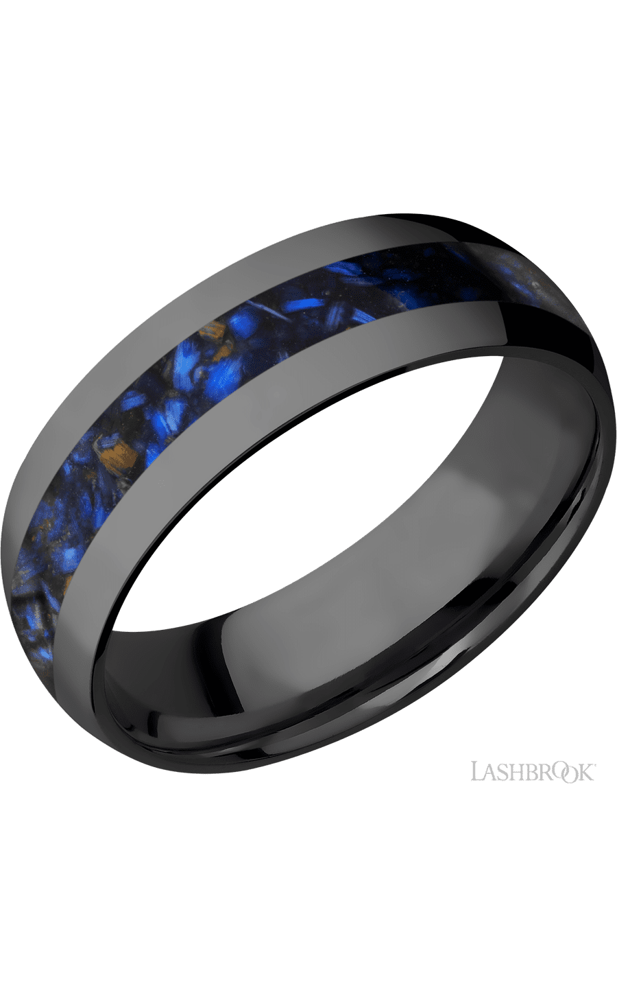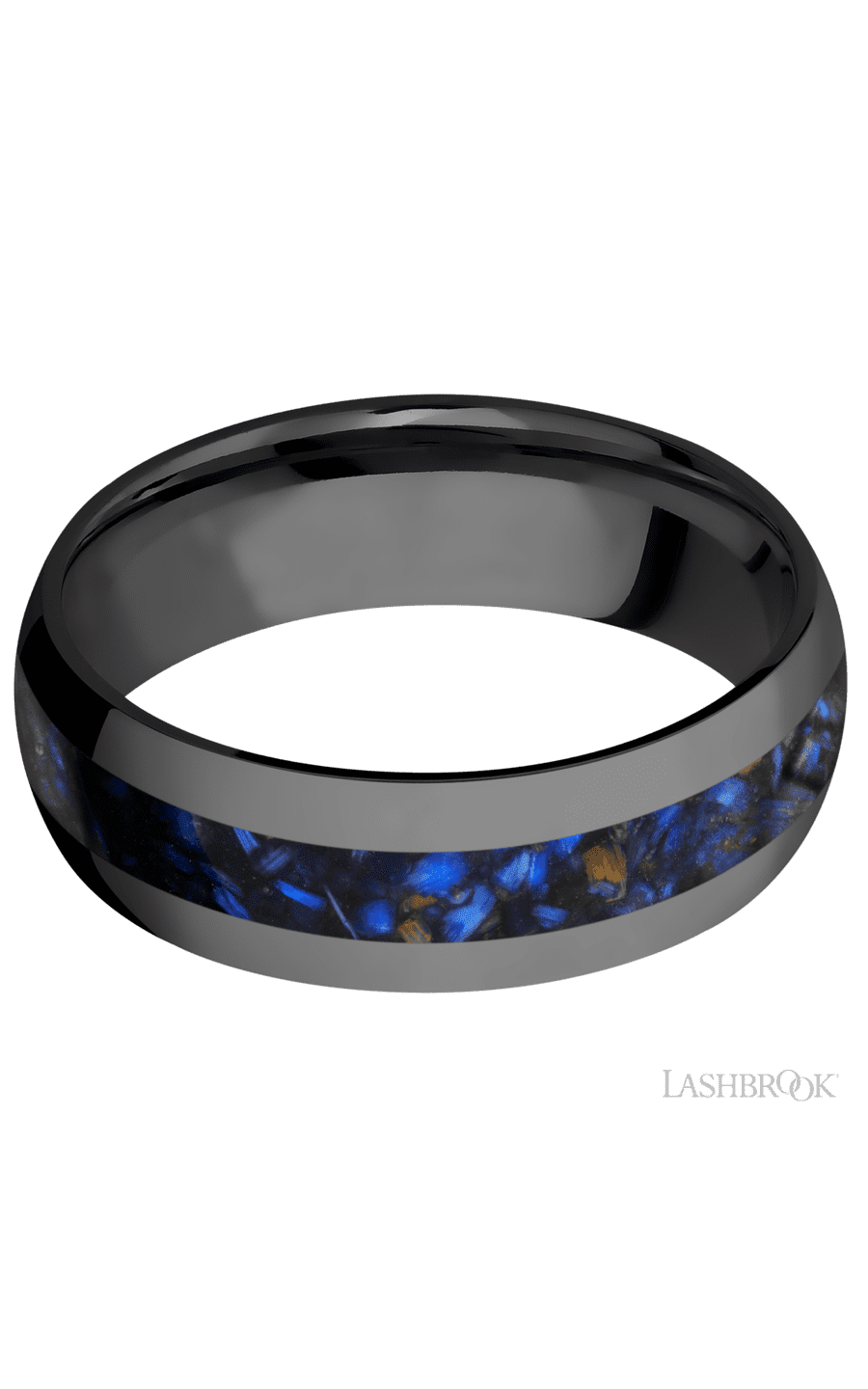 7 mm wide/Domed/Zirconium band with one 3 mm Centered inlay of Blue Tiger Eye.