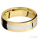 7 mm wide/Flat/14K Yellow Gold band with one 3 mm Centered inlay of 14K White Gold.