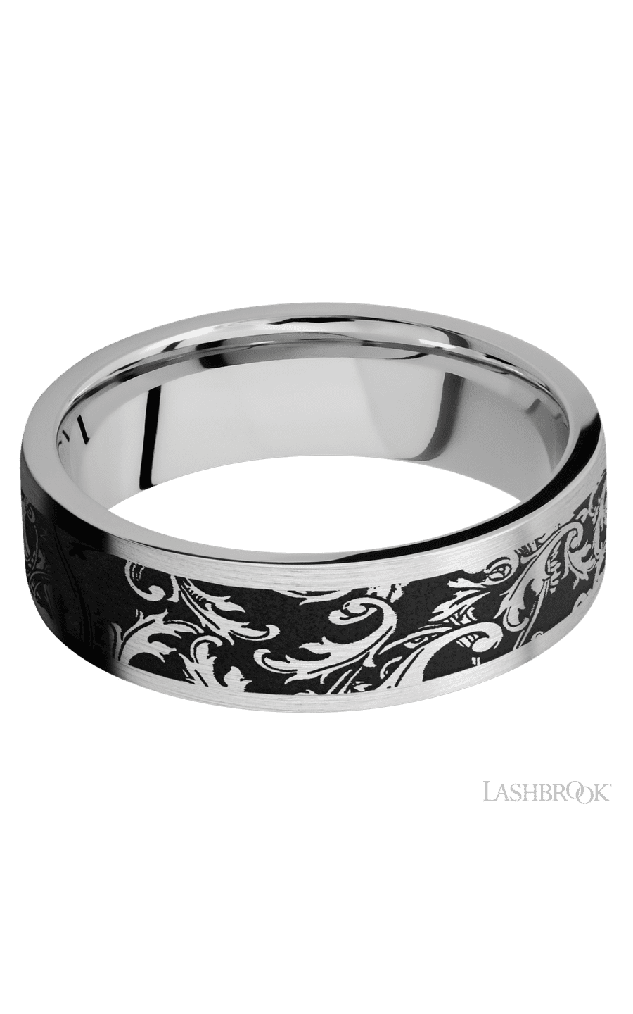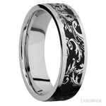 CC7F/LCVBLACKLEAF/A 7 mm wide/Flat/Cobalt Chrome band with a laser carved Black Leaf pattern.