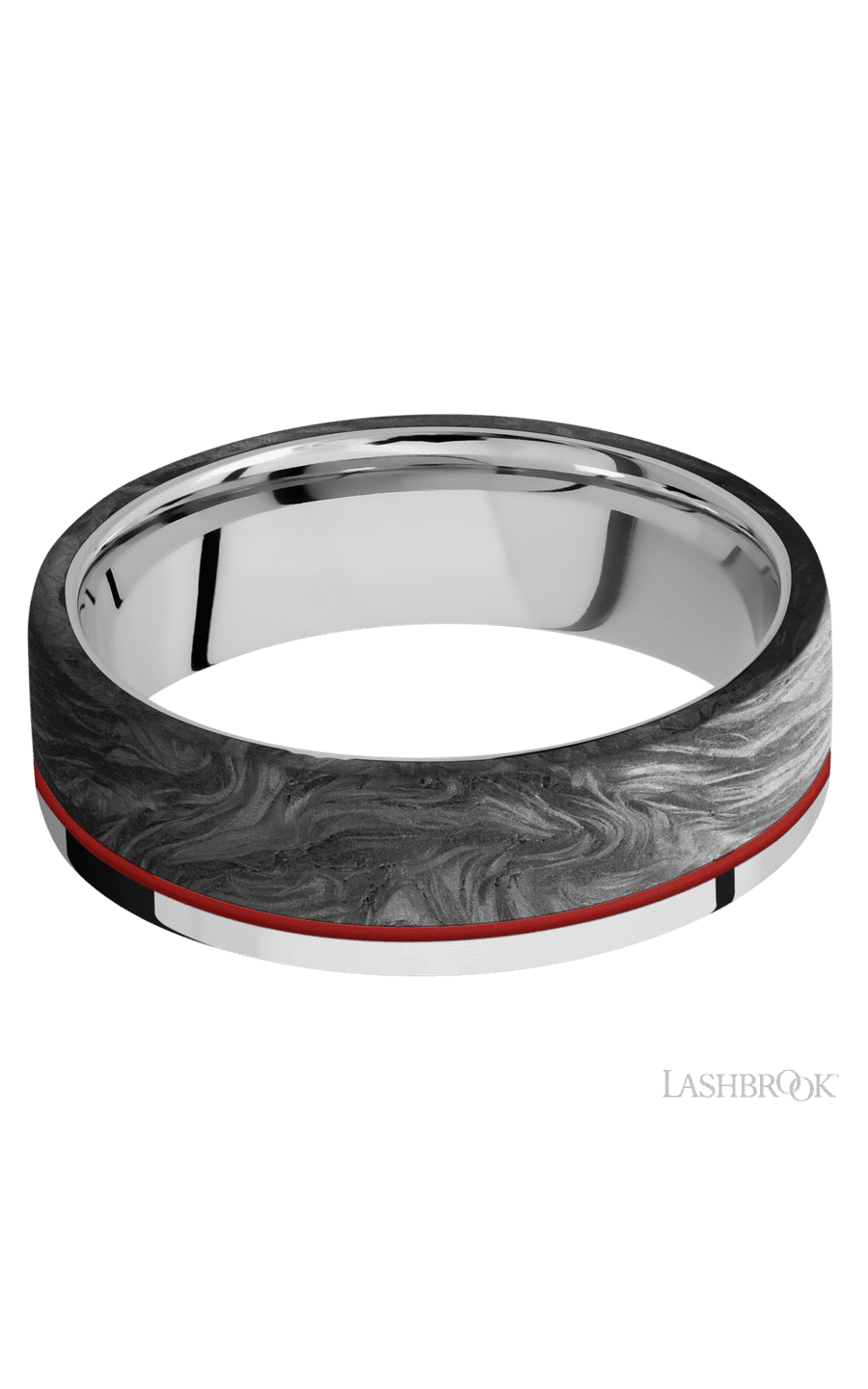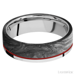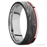 7 mm wide/Flat/Cobalt Chrome band with one 5 mm Off Center Edge inlay of Forged Carbon Fiber.