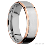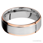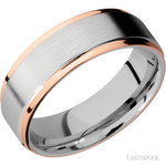 7 mm wide/Flat Grooved Edges/Cobalt Chrome band with two 1 mm Edge inlays of 14K Rose Gold.