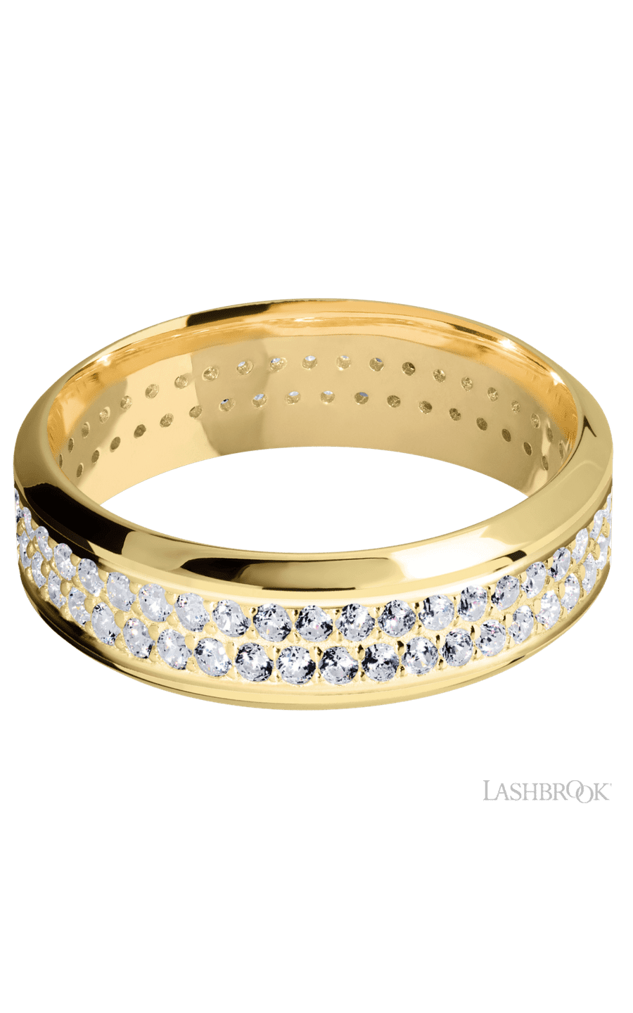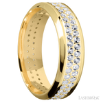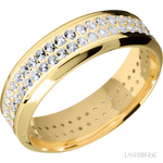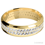 7 mm wide/High Bevel/14K Yellow Gold band with a 2 Row Eternity arrangement of .015 carat Round Diamond stones in a Bead Channel setting.