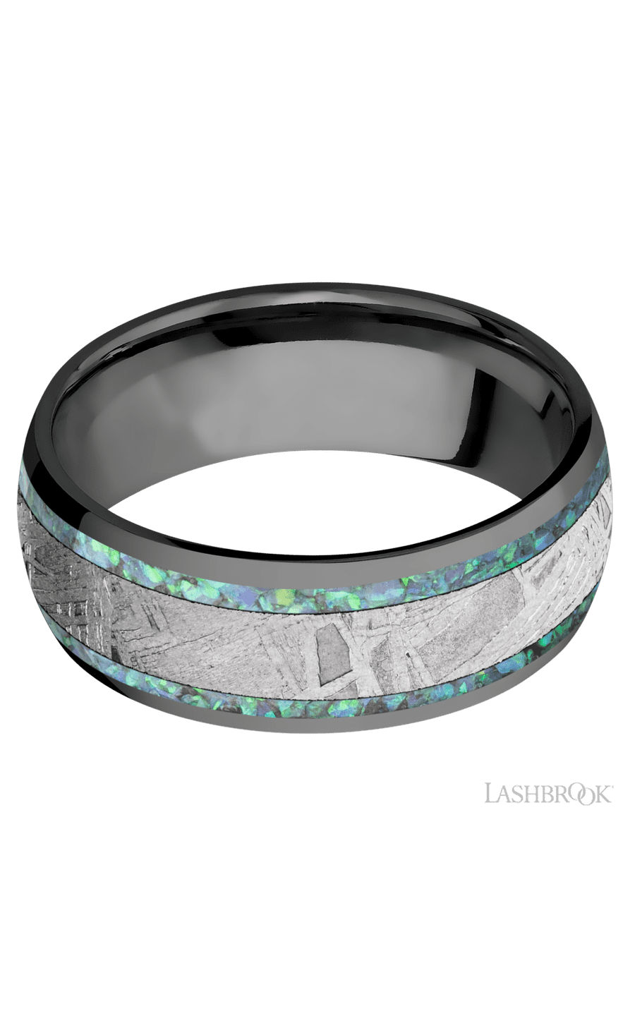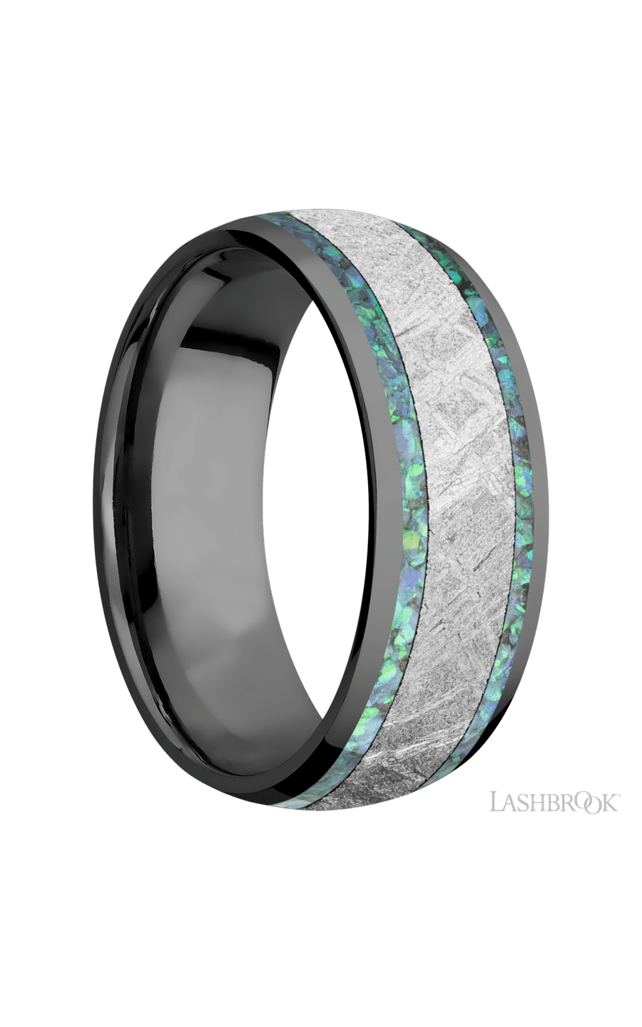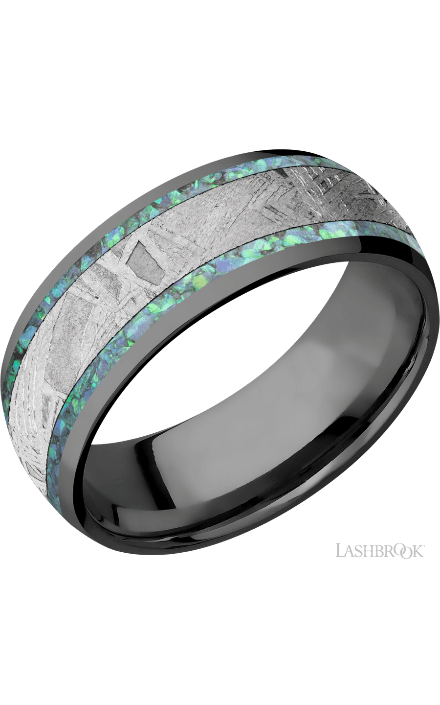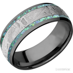 8 mm wide/Domed/Zirconium band featuring inlays of Teal Opal and Meteorite.