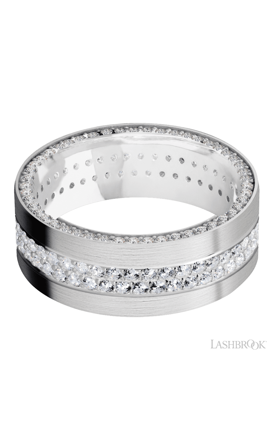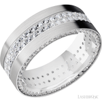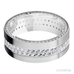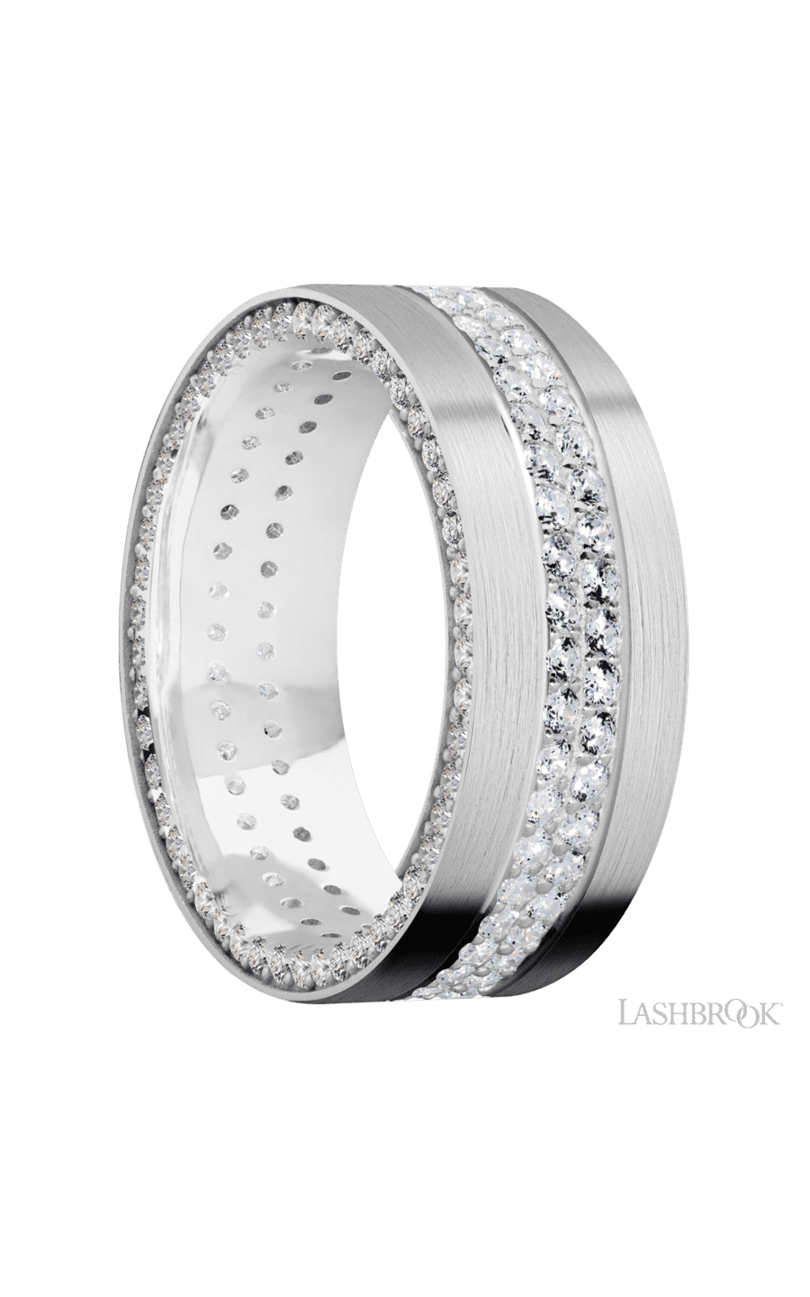 Lashbrook 8 mm wide/Flat/14K White Gold band with a Side Eternity arrangement of .01 carat Round Diamond stones in a Bead Channel setting and featuring a a 2 Row Eternity arrangement of .015 carat Round Diamond stones in a Bead Channel setting