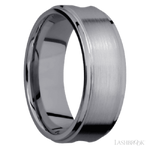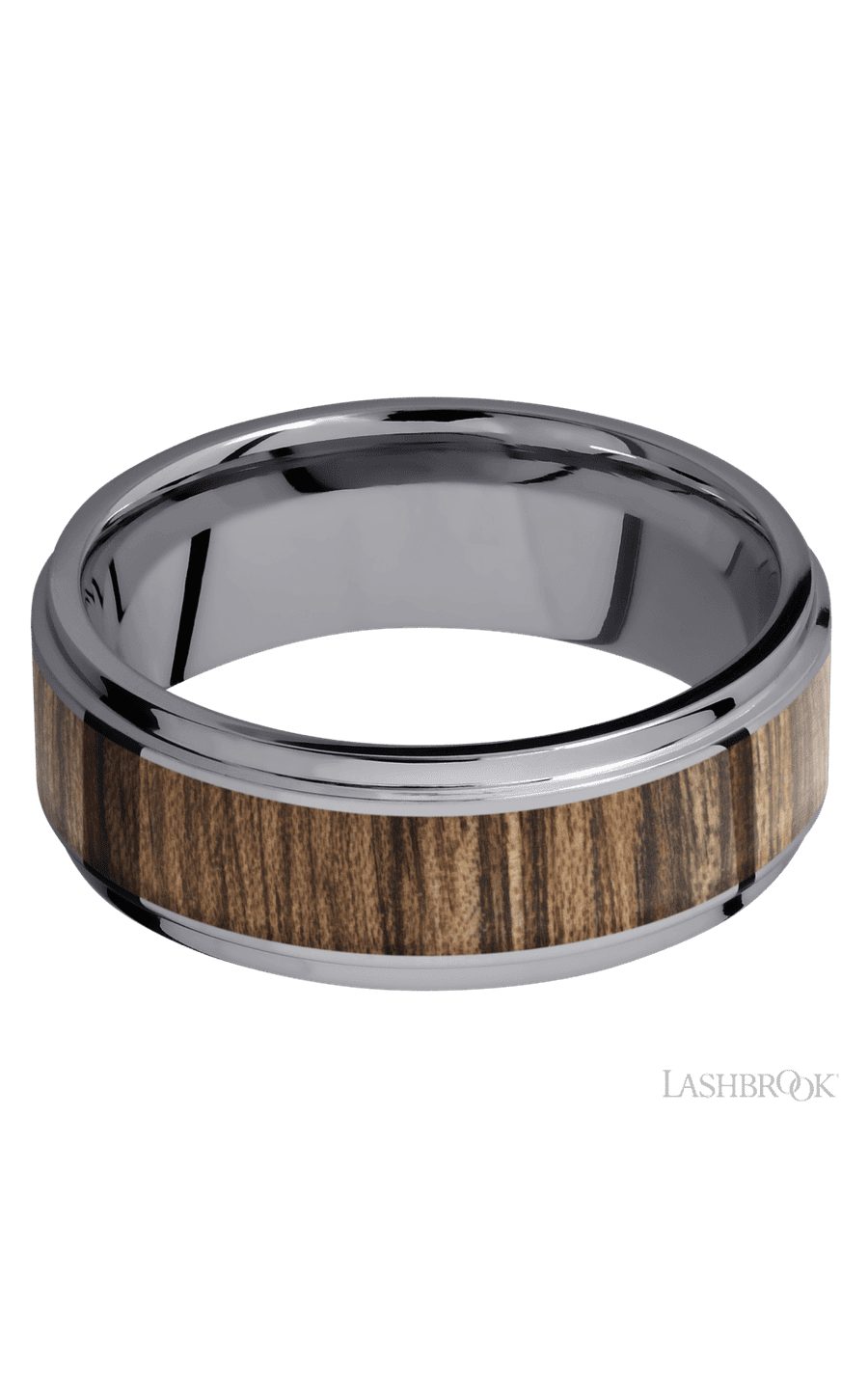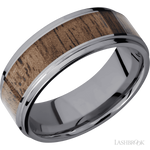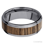 8 mm wide/Flat Grooved Edges/Tantalum band with one 5 mm Centered inlay of Walnut.