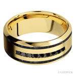 Lashbrook 9 mm wide/High Bevel/14K Yellow Gold band with two 1 mm Wide inlays of Black Onyx and featuring an arrangement of 9, .03 carat Round Black Diamond stones in a Channel setting